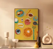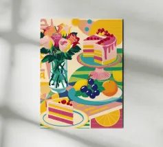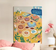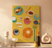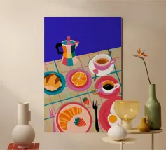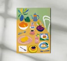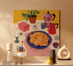 Illustrazione luminosa e allegra di un tavolo per la colazione illuminato dal sole, con caffè, succo d'arancia e pasticcini su un vivace sfondo giallo.