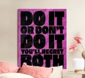 "Il testo nero in grassetto 'Fallo o non farlo, ti pentirai di entrambe le cose' è disposto in modo sovrapposto su uno sfondo rosa vibrante di carta stropicciata e trasmette un senso di urgenza e di riflessione esistenziale",