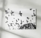 Colombe a Kathmandu. Fotografia di strada in bianco e nero. Colombe che volano nel cielo. Kathmandu in Nepal.
