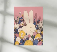 Due coniglietti pasquali stilizzati tra fiori colorati, pulcini e farfalle: un motivo allegro in stile poligonale, ideale per il periodo pasquale e l'inizio della primavera. Due coniglietti geometrici come motivo centrale Fiori primaverili colorati e crochi Inclusi simpatici pulcini e farfalle svolazzanti Design moderno e giocoso per la Pasqua Ideale per prodotti stagionali dal sapore primaverile