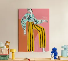This artwork depicts a person in a vibrant yellow floral top and blue pants, striking a dynamic pose against a pink background with orange floral patterns.