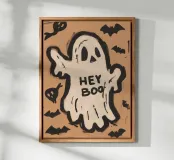 Un giocoso fantasma di Halloween circondato da pipistrelli.
