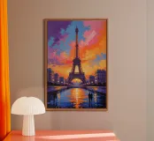 Questo dipinto impressionista cattura la Torre Eiffel al tramonto, che si riflette brillantemente nelle acque calme della Senna. Tratti audaci e vibranti di arancione, rosa e blu si fondono armoniosamente, creando un accattivante gioco di luci e colori. Il dipinto raffigura coppie che passeggiano lungo le rive del fiume, immerse nell'atmosfera romantica di Parigi. L'iconica torre si erge alta, immersa in tonalità calde, con la sua struttura intricata che risplende contro il cielo dinamico. Quest'opera d'arte emana un senso di calore e intimità, celebrando la bellezza senza tempo della Torre Eiffel nella sua cornice parigina.