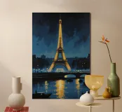 Questo incantevole dipinto a olio raffigura la Torre Eiffel illuminata dal suo bagliore dorato, che si riflette magnificamente sulla Senna. Le serene tonalità blu della notte creano uno sfondo perfetto, mentre le sottili sagome degli edifici e le luci delle lampade esaltano l'atmosfera romantica. Quest'opera d'arte cattura l'eleganza senza tempo e il fascino magico di Parigi sotto il cielo stellato, rendendola un capolavoro di bellezza notturna.