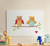 Simpatici gufi dipinti ad acquerello su un ramo con un cuore allegato.