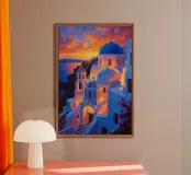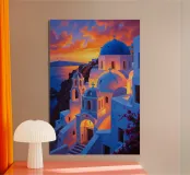 Un'ipnotica pittura a olio che cattura l'incantevole bellezza di Santorini al tramonto. Le iconiche chiese dalle cupole blu sono immerse nella calda luce di un tramonto vibrante, con sfumature di arancio, rosa e viola che si fondono con il blu profondo del mare. Le strutture a cascata imbiancate a calce creano un'armonia visiva sorprendente, ornata da bouganville in fiore che aggiungono sprazzi di colore vivace. Questo ritratto senza tempo racchiude il romanticismo, la serenità e i panorami mozzafiato dell'isola.