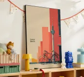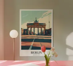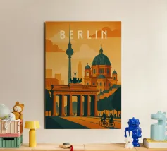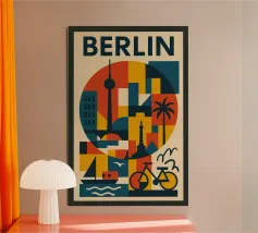"Explore Berlin" cattura lo spirito della città attraverso una vibrante composizione retrò. Caratterizzata dall'iconica Fernsehturm (Torre della televisione), da una bicicletta d'epoca e da audaci blocchi di colore architettonici, questa opera d'arte è perfetta per gli amanti di Berlino, del design urbano e degli interni ispirati ai viaggi.