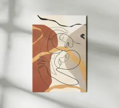 Questa opera d'arte presenta una serie di disegni al tratto di volti interconnessi su uno sfondo scuro. Le linee sono continue e creano un senso di unità e connessione.