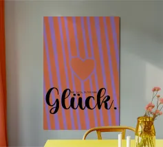 Accogliente illustrazione di un libro e di una tazza fumante su un tavolo con una tovaglia floreale. Il libro dice: Il cielo era grigio oltre la finestra, ma i pensieri erano leggeri e il caffè gentile nel suo calore. Dal nulla... Sopra ogni cosa la grande scritta "Glück" (felicità). Tovaglia rosa antico, sfondo rosso vivo, scritte giallo-beige. Sotto la scritta Coffee & Books.