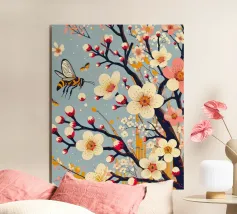 Il disegno dettagliato presenta una varietà di fiori vivaci visitati da api indaffarate.