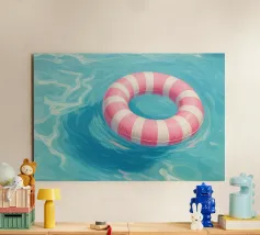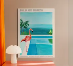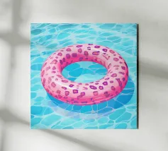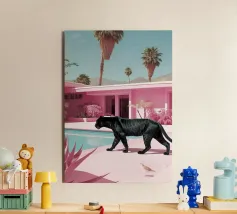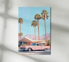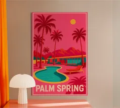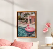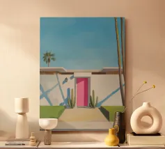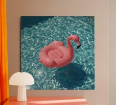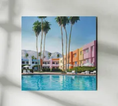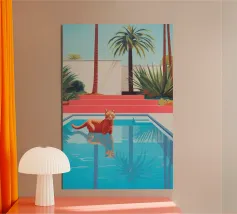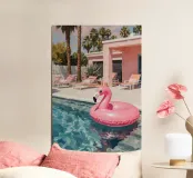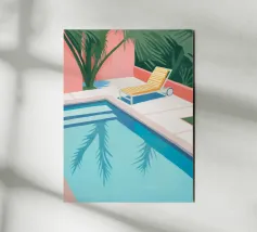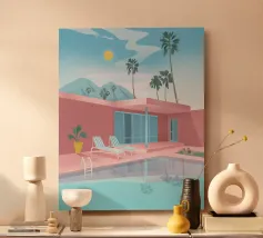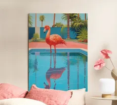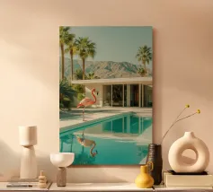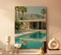 Una scena nostalgica di Palm Springs: un fenicottero rosa che nuota alla deriva in una piscina turchese, incorniciata da morbidi lettini pastello e palme svettanti. Quest'opera d'arte conferisce uno spirito estivo retrò, un'atmosfera vacanziera rilassata e un fascino di metà secolo a qualsiasi parete, ideale per soggiorni, camere da letto o per un arredamento elegante a bordo piscina.