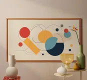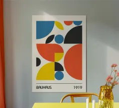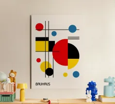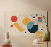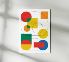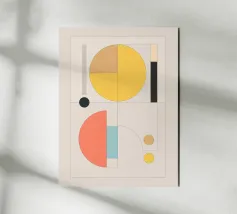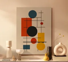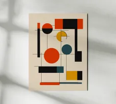 L'opera d'arte presenta una disposizione dinamica di forme geometriche dai colori vivaci. Cerchi, rettangoli e linee si intrecciano, creando un senso di movimento ed equilibrio.