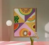 con una varietร  di frutta fresca come melone, uva, anguria, avocado e kiwi in forme geometriche.