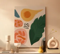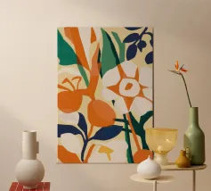 Un'opera d'arte astratta vibrante ed espressiva con una fusione di colori audaci di ispirazione fauvista come il magenta, l'arancione e il nero. Le pennellate e le forme energiche creano un'opera dinamica e appassionata.
