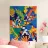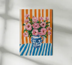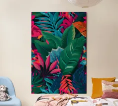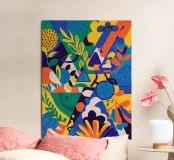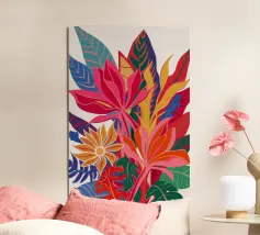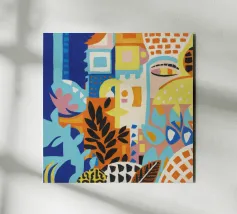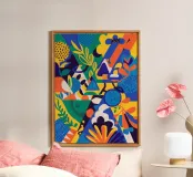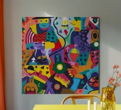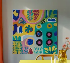 Una composizione astratta che fonde elementi floreali stilizzati con audaci forme geometriche in una vibrante tavolozza di blu, gialli, arancioni e verdi, creando una dichiarazione artistica dinamica e moderna.