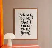 La stampa tipografica I Solemnly Swear That I Am Up to No Good presenta un'audace scritta disegnata a mano in nero su uno sfondo bianco. Questa dichiarazione maliziosa, ispirata al magico mondo di Harry Potter, aggiunge un tocco giocoso a qualsiasi stanza. Perfetta per i fan della serie o per chiunque abbia uno spirito ribelle, questa stampa accattivante fa la sua figura in case, uffici o dormitori. Il contrasto netto e il design elegante la rendono adatta a diversi stili di arredamento, dal moderno all'eclettico.