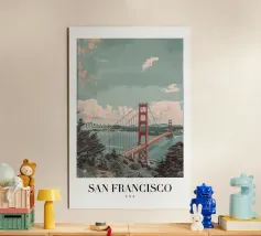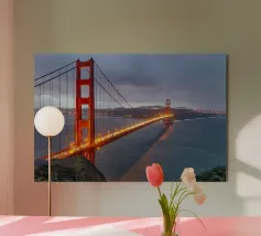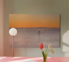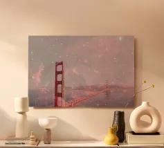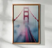 Una vista ipnotica del Golden Gate Bridge mentre sfuma in un oceano di nebbia. La vivida struttura rossa si estende con grazia in lontananza, con i suoi dettagli ammorbiditi dalla nebbia circostante. Questa immagine eterea cattura il fascino del famoso simbolo di San Francisco, incorniciato dall'atmosfera serena e drammatica della natura circostante. L'interazione tra l'architettura solida e la nebbia fluida crea un momento di sospensione del tempo, in cui la natura e la realizzazione umana coesistono armoniosamente.