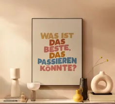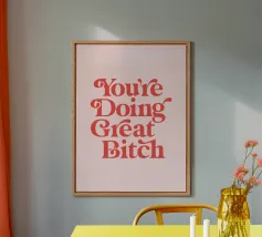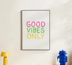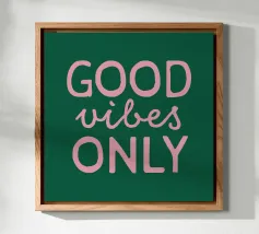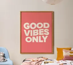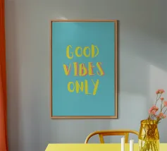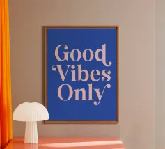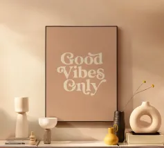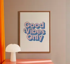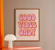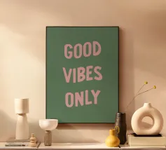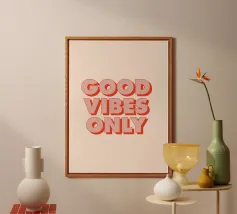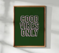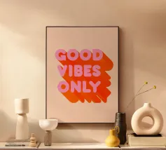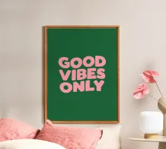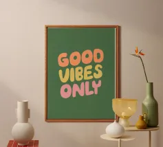 Infondete il vostro spazio di positività con questa stampa tipografica di ispirazione rétro. La frase edificante "Good Vibes Only" è riportata in caratteri retrò color pesca su un ricco sfondo verde petrolio. Questo pezzo accattivante combina il fascino vintage con un mantra moderno, perfetto per aggiungere un tocco di ottimismo a qualsiasi ambiente. Dalla zona giorno all'ufficio, questa opera d'arte rallegra l'umore e promuove un'atmosfera positiva. Lasciate che questa elegante stampa serva da promemoria quotidiano per abbracciare la buona energia e mantenere una visione ottimistica della vita.