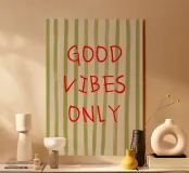 Un messaggio luminoso ed edificante per una casa felice. Questa scritta a mano riporta la classica frase "GOOD VIBES ONLY" su un allegro sfondo a righe.