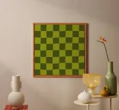 Portate nel vostro spazio un'energia fresca e audace con questa stampa a scacchiera verde linfa dal sapore retrò. I suoi quadretti ondulati e disegnati a mano emanano una giocosa atmosfera vintage, pur rimanendo minimalisti e moderni. Perfetta per gli interni eclettici, per le decorazioni murali retrò o per tutti coloro che amano i motivi d'arte vivaci con un'ispirazione anni '70 senza tempo.