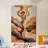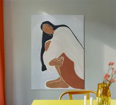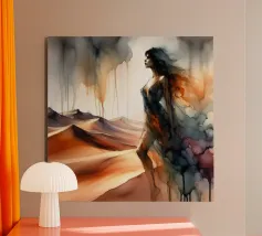 Una donna è raffigurata in morbide onde ondeggianti di tonalità dorate e terrose, che incarnano fluidità e tranquillità. La sua espressione è di dolce contemplazione, mentre si abbraccia in un momento di profonda riflessione. Lo sfondo si integra perfettamente con le sue forme, simboleggiando l'interconnessione tra le emozioni umane e la natura. Le pennellate calde e delicate creano una sinfonia visiva che evoca un senso di benessere e di appartenenza. Questo dipinto celebra la forza e la sensibilità della femminilità, fondendo l'astrazione moderna con una profondità emotiva senza tempo.