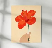 "Hibiscus Affection" showcases the gentle embrace of an orange hibiscus in hand, capturing the warmth and tenderness of human connection with nature. The vibrant bloom symbolizes love and tranquility, offering a moment of serene beauty.