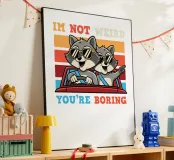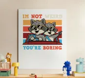 Due procioni con occhiali da sole viaggiano allegramente su un'auto rossa, con uno sfondo giocoso e colorato. La didascalia recita: "Io non sono strano, tu sei noioso".
