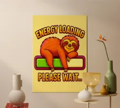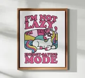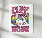 Un unicorno colorato con una criniera arcobaleno si trova sotto la frase "Non sono pigro, sono in modalità risparmio energetico" in lettere rosa. Lo sfondo è caratterizzato da un blocco di colori pastello che esalta il tema giocoso e stravagante.