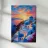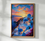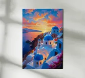 Quando il sole tramonta su Santorini, le sue iconiche chiese dalle cupole blu sono immerse in una luce calda, che contrasta meravigliosamente con le profonde tonalità arancioni e viola del cielo. Questo dipinto a olio cattura la bellezza senza tempo dell'architettura a cascata dell'isola greca e la tranquillità del Mar Egeo. La vibrante bouganville aggiunge un'esplosione di colore, mentre il delicato bagliore delle finestre e delle lanterne emana calore e fascino. Quest'opera d'arte racchiude perfettamente l'incantevole fascino delle serate di Santorini.