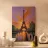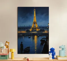 Questo dinamico dipinto impressionista raffigura la Torre Eiffel che risplende sotto un vibrante tramonto. Il gioco di luci e ombre crea una straordinaria gamma di colori, dal giallo oro al viola intenso. Le pennellate strutturate conferiscono profondità al cielo, mentre il riflesso scintillante del canale esalta l'armonia della composizione. Incorniciata da alberi e strade parigine, la torre rimane il fulcro, rappresentando il fascino senza tempo della capitale francese.