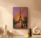 Questo dinamico dipinto impressionista raffigura la Torre Eiffel che risplende sotto un vibrante tramonto. Il gioco di luci e ombre crea una straordinaria gamma di colori, dal giallo oro al viola intenso. Le pennellate strutturate conferiscono profondità al cielo, mentre il riflesso scintillante del canale esalta l'armonia della composizione. Incorniciata da alberi e strade parigine, la torre rimane il fulcro, rappresentando il fascino senza tempo della capitale francese.