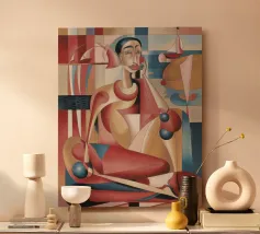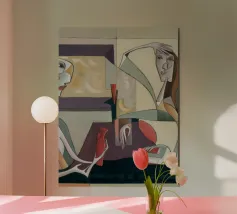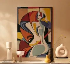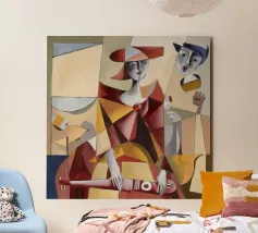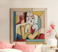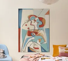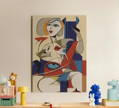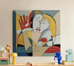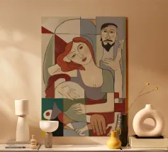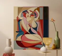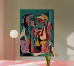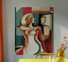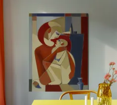Questo dipinto presenta due figure astratte in una posa intima e ravvicinata. L'uso di forme geometriche e di colori decisi aggiunge profondità e complessità alla scena.