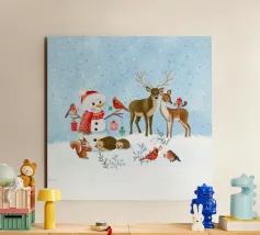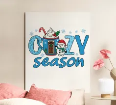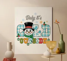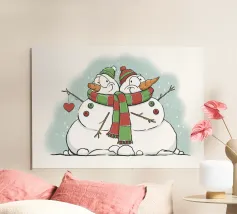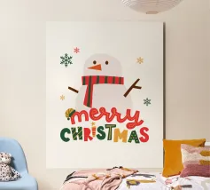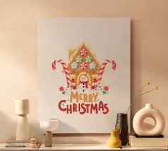 Un allegro pupazzo di neve e un omino di pan di zenzero si trovano accanto a una grande scritta rossa "JOY" ornata da fiocchi di neve e circondata da decorazioni natalizie. Scatole regalo e ornamenti festosi completano il tema stagionale.