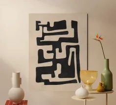 Quest'opera attira lo sguardo in una danza ipnotica di forme nere! Linee spesse e curve e spirali si fondono in un labirinto dinamico su uno sfondo color crema: un gioco di positivo e negativo, movimento e calma. Lo stile è un puro minimalismo organico con pennellate espressive, influenzato dalle silhouette di Matisse e dalla potenza grafica della modernità di metà secolo. Il dipinto crea una profondità meditativa, suscita curiosità ed equilibrio interiore, permettendo allo spettatore di sprofondare nella contemplazione. Per ambienti che richiedono elegante raffinatezza e chiarezza spirituale.