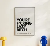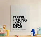 "Le parole 'YOU'RE F*CKING LAZY BITCH' sono impilate in un carattere sans-serif nero in grassetto, con l'asterisco che censura la 'U' di 'FUCKING', seguito dalla frase 'PUT DOWN PHONE AND GET UP' in un carattere serif più piccolo e delicato, il tutto su uno sfondo bianco sporco",