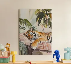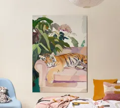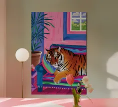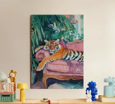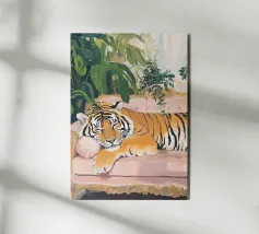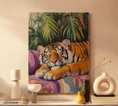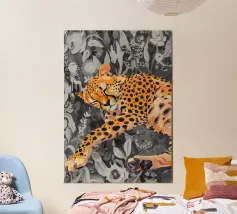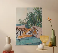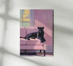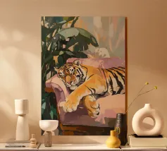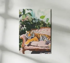 Un'opera d'arte serena e stravagante di un ghepardo che sonnecchia pacificamente su un divano vintage a righe bianche e verdi. I motivi vivaci e la postura accogliente del grosso felino creano un contrasto sognante e spiritoso tra la natura selvaggia e la rilassata vita domestica. Perfetto per gli amanti degli animali, i collezionisti d'arte eclettica e gli appassionati di estetica d'interni giocosa.