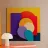 Vibranti forme geometriche in viola, rosso, giallo e blu si sovrappongono su un audace sfondo giallo e scuro, mostrando un'arte astratta dal tocco moderno.