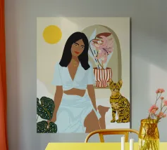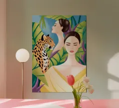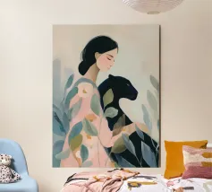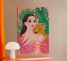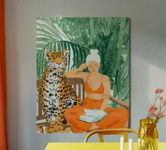 This artwork captures a person in a black dress striking a poised pose beside a leopard. The scene exudes sophistication, confidence, and timeless artistry.