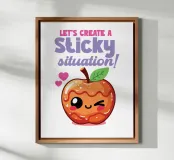 Una simpatica mela dei cartoni animati ricoperta di caramello ammicca giocosamente, accompagnata da due cuori rosa. Il testo recita: "Creiamo una situazione appiccicosa!".