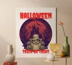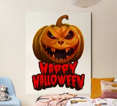 Due zucche maliziose con ghigni minacciosi. La frase "Let's put a smile on that face" (mettiamo un sorriso su quella faccia) è riportata in grassetto, a caratteri scherzosi.