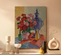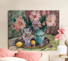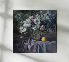 Una natura morta con una brocca d'argento riempita con un rigoglioso bouquet di lillà viola e rosa. Un bicchiere di vino rosso e della frutta si trovano su una superficie scura e lucida che riflette gli oggetti.