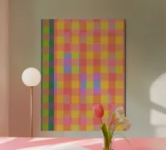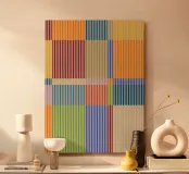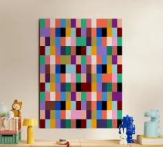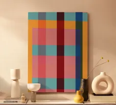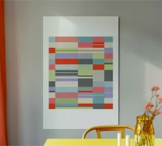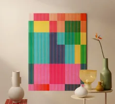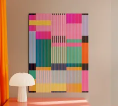 Un motivo geometrico di grande impatto, caratterizzato da sottili strisce verticali in tonalità vivaci di rosso scuro, blu, verde, rosa, giallo e arancione su un morbido sfondo beige. Questo disegno crea un dinamico effetto patchwork con un giocoso gioco di colori e un'estetica moderna di ispirazione Bauhaus. Perfetto per ravvivare l'arredamento della casa, gli accessori, l'abbigliamento e molto altro ancora, grazie al suo fascino pulito e contemporaneo e al vivace stile a righe!