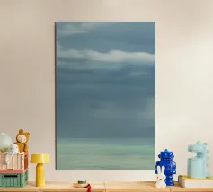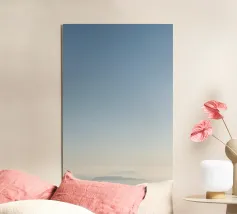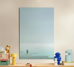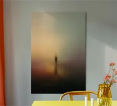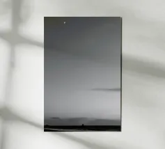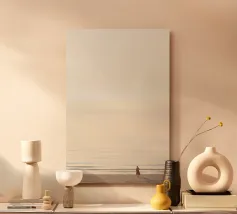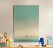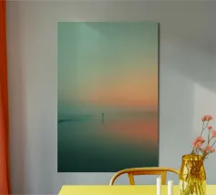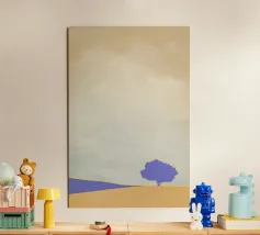 Un albero solitario si erge ai margini di un tranquillo paesaggio da sogno, dove il cielo di colore verde acqua si fonde con un orizzonte beige che sussurra. L'immobilità minimalista di quest'opera d'arte evoca solitudine, introspezione e la sottile forza della natura sospesa nel tempo.