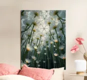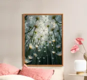 Questo incantevole pezzo cattura una vista mozzafiato, a occhio di verme, di un campo fantastico dove fiori bianchi e traslucidi con delicati petali a ventaglio si protendono verso il cielo. I fiori eterei, che ricordano dente di leone o giglio, sono illuminati dall'interno e proiettano una luce calda e dorata che crea un'atmosfera magica e onirica. Sotto gli steli si intravede un rigoglioso e verdeggiante suolo forestale, che ancorano la scena ultraterrena a un senso di meraviglia naturale. La composizione attira lo sguardo verso l'alto, in direzione di un baldacchino radioso, simile a una stella, che suggerisce una meraviglia celeste o architettonica che funge da sfondo.