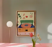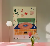 Un'illustrazione allegra e vibrante di un giradischi portatile vintage, che sprigiona energia Groovy/Retro. La custodia del giradischi è decorata con un audace motivo a scacchi bianchi e arancioni senape, che unisce gli stili geometrici della Pop Art a un'atmosfera disegnata a mano. Il vinile arancione è caratterizzato da vorticose linee bianche che suggeriscono movimento e musica. Intorno alla scena fluttuano note musicali astratte, fiori stilizzati e un cuore rosso brillante, simbolo di una canzone d'amore o della passione per la musica. Su uno sfondo a strisce gialle e rosa, questo pezzo è puro Dopamine Decor e ideale per gli amanti della musica. Il
