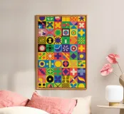 Un motivo complesso e vivace composto da una griglia di piastrelle geometriche, ognuna con un disegno e una combinazione di colori unici, che creano una matrice visiva sorprendente.