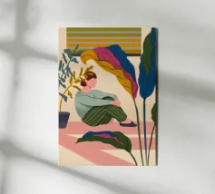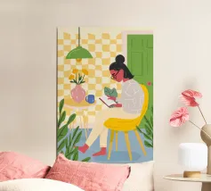 An illustration of a woman intently reading a book at her desk, surrounded by houseplants and illuminated by a lamp, conveying a sense of quiet focus.