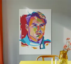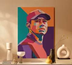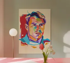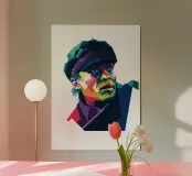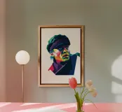 Miles Davis nello stile WPAP è ritratto con forme audaci e angolari e una vibrante esplosione di colori contrastanti. Il suo sguardo intenso, gli zigomi alti e la sua caratteristica tromba sono stilizzati con precisione geometrica, catturando il suo spirito innovativo e ribelle. La composizione, astratta ma riconoscibile, riflette la sua leggendaria influenza sul jazz, fondendo l'estetica moderna della pop-art con l'energia dinamica della sua musica.