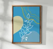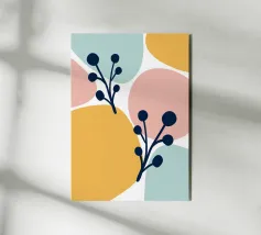 Un disegno botanico minimalista presenta un ramo bianco delineato con foglie. Linee curve e forme organiche nei toni del blu, del verde e del giallo creano uno sfondo moderno e astratto.