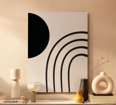 Opera d'arte geometrica minimalista con linee nere e un semicerchio nero su uno sfondo beige neutro e morbido. Opera d'arte astratta e moderna con texture morbide per gli stili di interni Bohemien, Moderno, Industriale e Basic. Bella per il soggiorno, lo studio o l'ufficio.